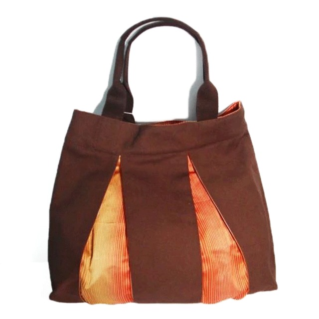 着物コート地と帆布のコンビ タックの中から見える着物地がオシャレな一点です♪ 帆布がベースなので、書類を入れても丈夫です! ■サイズ表記 縦=34 横=30 マチ=10 ■カラー 茶×オレンジ系 ■素材(表地) 綿・シルク ■商品説明 内ポケット有